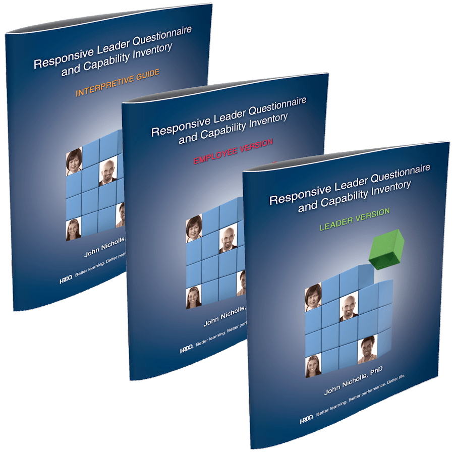 The Leader Version is used by a manager. It contains two separate assessments, each with directions for manually scoring results. First, they complete the 16-item Responsive Leader Questionnaire (RLQ), which asks them to assess their leadership style with an employee with whom they have a direct reporting relationship (that employee must subsequently complete the Employee Version). The manager scores the RLQ.
